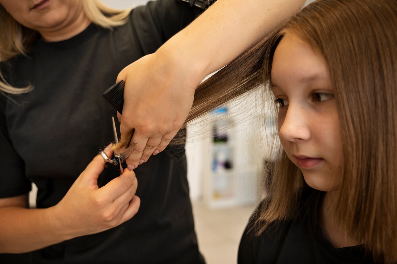 After the cut. This can include blow-drying, curling, diffusing, straightening, or adding texture using products and styling tools.